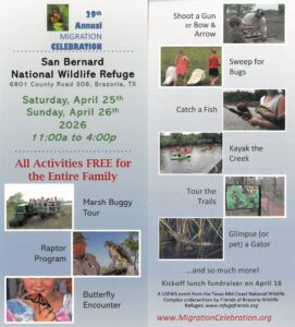 This year’s event includes several free activities for children, including: archery, fishing, bug sweeping, microscopes, touch tanks and reptiles. Adults and children can both enjoy the very popular “Birds of Prey” show by EarthQuest as well as the butterfly encounter tents. Refuge tours given by qualified naturalists can be enjoyed by marsh buggy or wagon. Guided walking tours to Bobcat Woods and to the largest Texas Live Oak are also available. All the photo contest entries can be seen in the exhibition building as well as many other nature related exhibits.