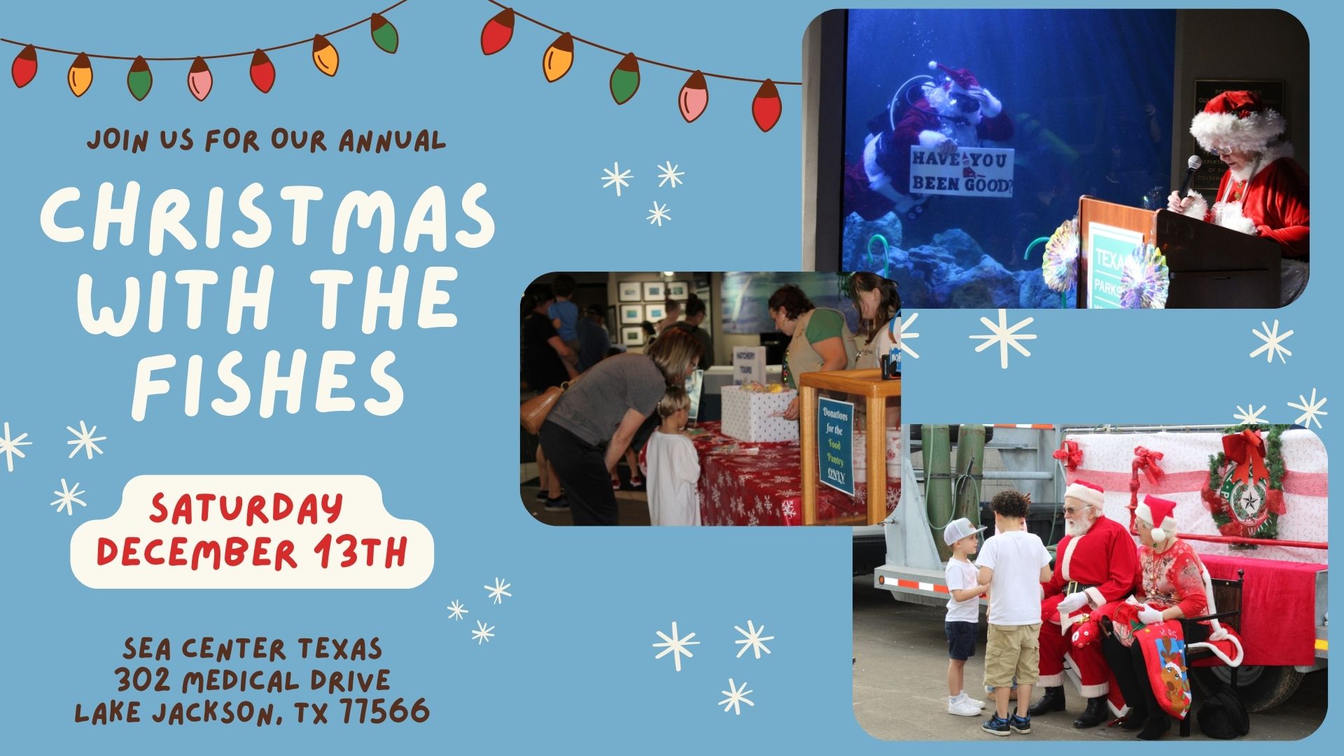 Dec 13 1:00 pm - 3:00 pm Christmas with the Fishes Sea Center Texas 302 Medical Drive, Lake Jackson Event Details Get Directions